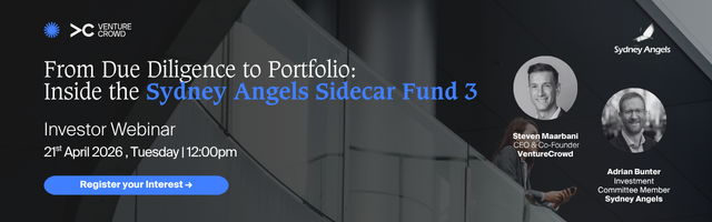 Join Sydney Angels and VentureCrowd for an exclusive webinar on the Sydney Angels Sidecar Fund 3 (SASF3) one of Australia's most compelling early-stage venture capital opportunities. In this session, Adrian and Steve will walk you through: - The investment case for private markets and why now is the time to act - The SASF3 fund structure, tax benefits, and how the ESVCLP program works - Sydney Angels' rigorous due diligence process and what makes a company fund-worthy - The latest portfolio companies joining the fund, including iiShield, Mary Technology, Crosscourt AI, and more - How to get involved and what the next steps look like Whether you're an existing investor looking for an update or considering your first investment into private markets, this webinar will give you everything you need to make an informed decision.